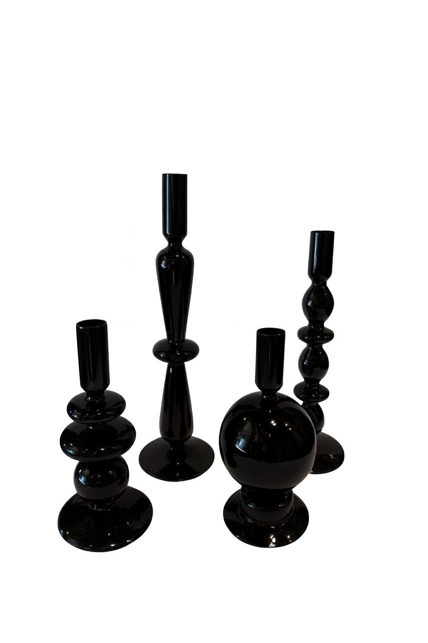 A sleek collection of four black glass candle holders in bold, sculptural shapes. Perfect for creating a dramatic and elegant ambiance in modern interiors.