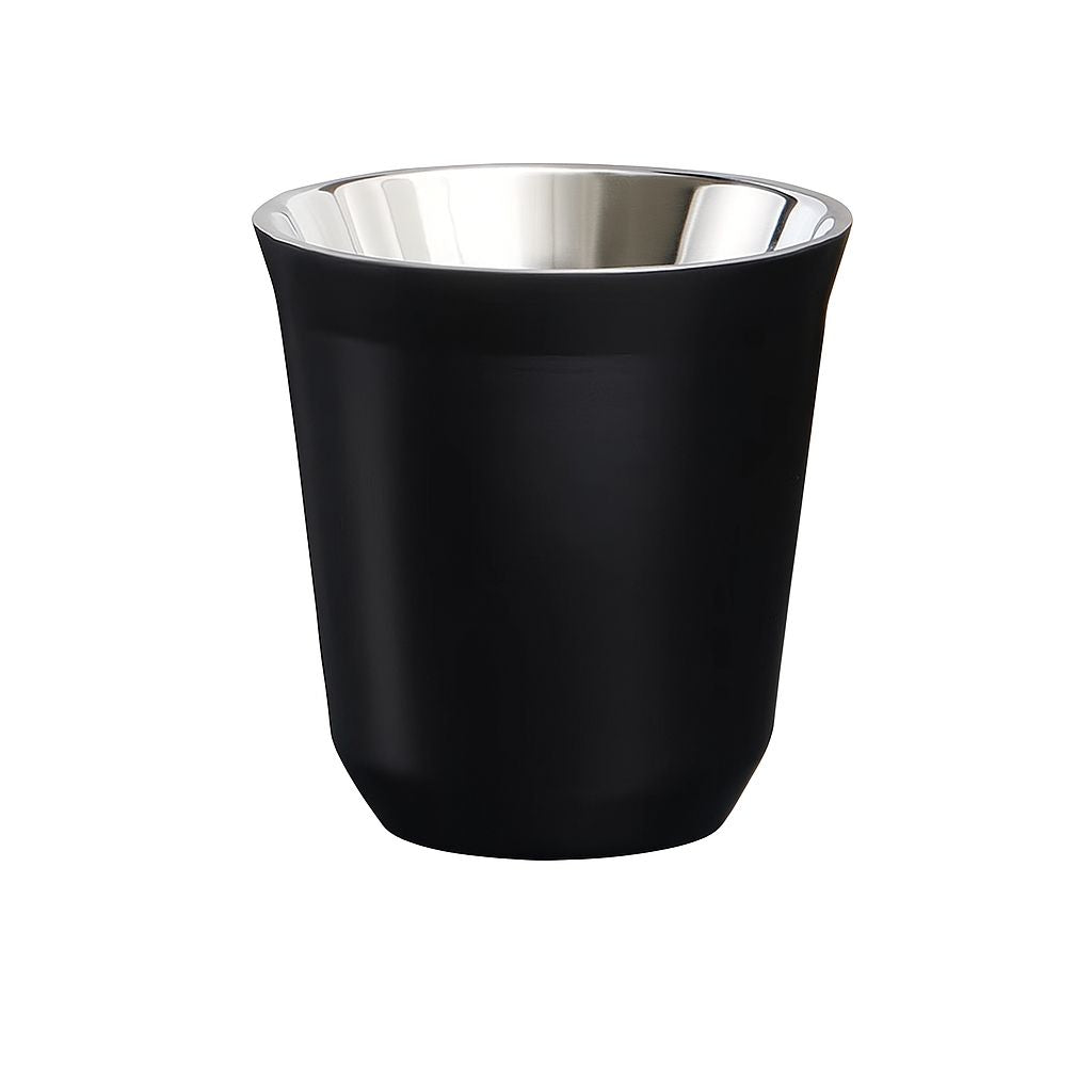 A stylish single espresso cup featuring a matte black exterior and polished stainless steel interior. Its double-wall insulation maintains the ideal coffee temperature while keeping the outside cool. A bold and modern addition for espresso enthusiasts.