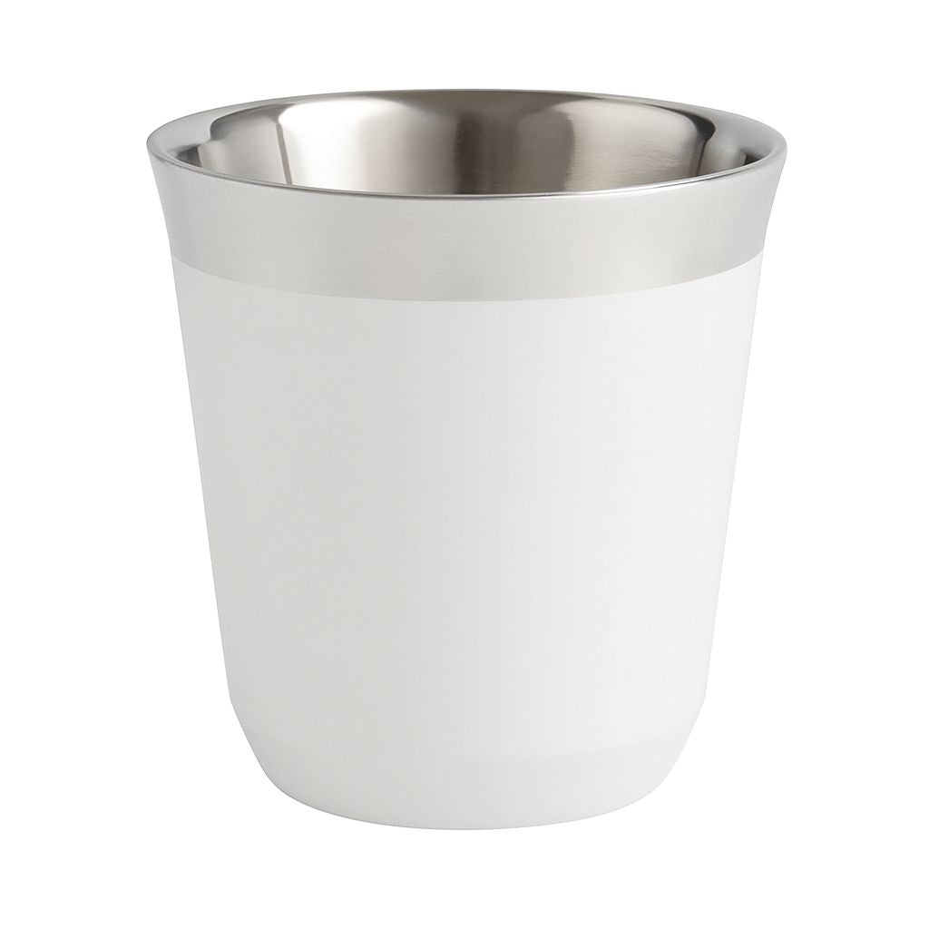 A modern single espresso cup featuring a sleek white exterior and brushed stainless steel interior. The double-wall design keeps your coffee hot while remaining cool to the touch. Ideal for espresso lovers who appreciate clean aesthetics and thermal efficiency